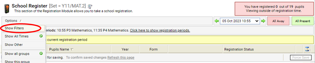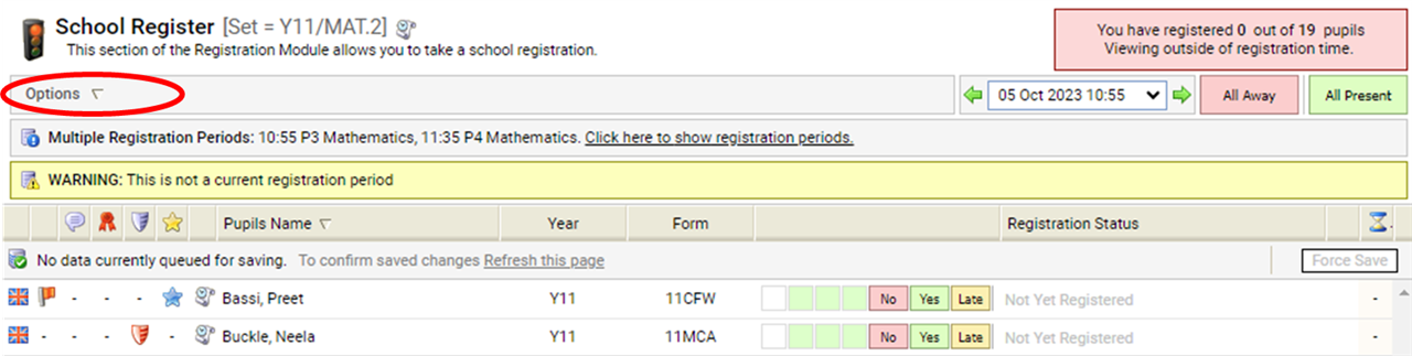 If you are the designated teacher for a register at this time then it will automatically take you to your register. If you need to find another register click on Options