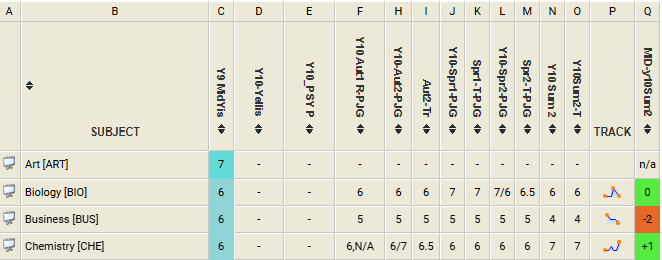 In this example, the final column is calculated, showing the difference between the pupil's baseline (column C) and summer grades (column 0)