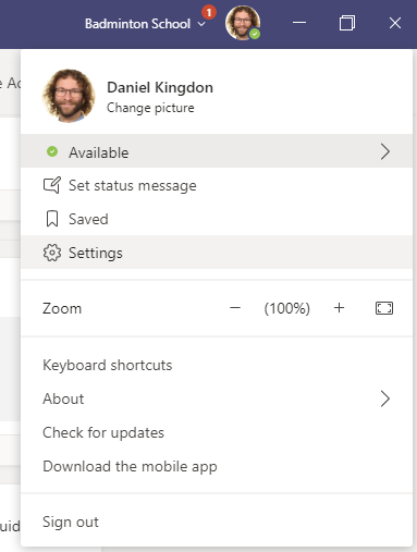 Step 2 - Click on your picture in the top right of the teams application and then click on settings