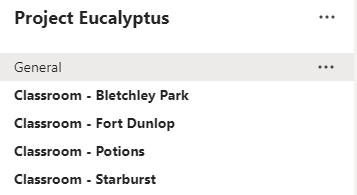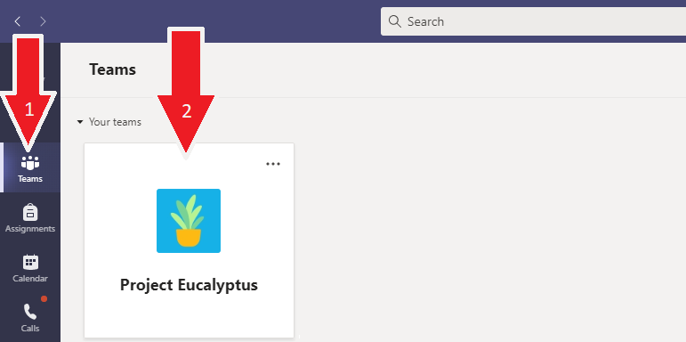 Step 1 - Find the Team you are using for the day by click on Teams in the left bar and then the name of the Team. In the screen shot below we are using "Project Eucalyptus"